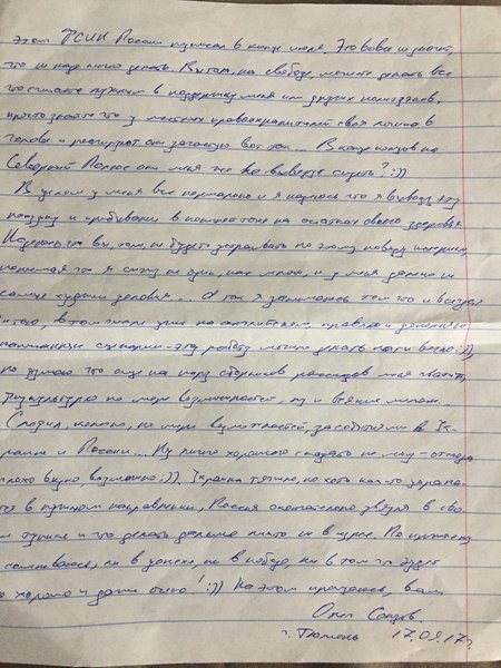 Письмо датировано 17 сентября и было отправлено из СИЗО-1 города Тюмень 21 сентября