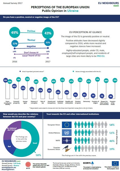 Европейскому Союзу доверяют 58% граждан Украины. Таковы результаты опроса проекта "Восточное соседство ЕС", проведенного с марта по май 2017 года во всех шести странах "Восточного партнерства".