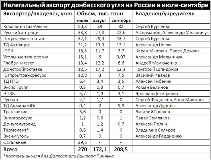 В сентябре 77,8% всей контрабанды, или 161,4 тыс. тонн, пришлось на четыре российские фирмы: "Компания Газ-Альянс", "Петролеум капитал" (обе подконтрольны Сергею Курченко), ТД "Антрацит" и "Русский антрацит".