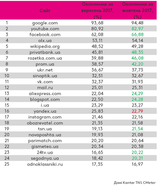 Отметим, что российские сайты в ТОП-10 не попали и продолжают терять рейтинг. В частности, охват Yandex.ua уменьшился на 3% (16 место), Vk.com - на 0,44% (11 место), Ok.ru - 0,38% (25 место).