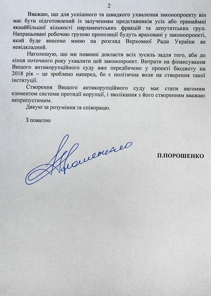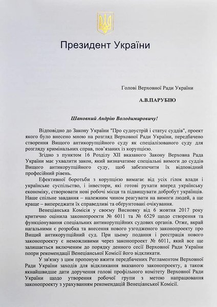 Президент направил письмо главе Верховной Рады с предложением принять предусмотренные Регламентом меры для отзыва законопроекта №6011 "Об антикоррупционных судах", а также как можно скорее поручить главе профильного комитета создать рабочую группу по наработке соответствующего законопроекта с учетом рекомендаций Венецианской комиссии.