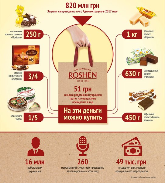 Аналитический ресурс "Слово і діло" подсчитал, что каждый работающий украинец тратит на содержание президента Украины и его Администрации 51 грн в год. Фокус выяснил, сколько конфет Roshen можно было бы купить на эти деньги