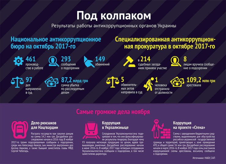 Исключая политическую подоплеку, результаты скоординированной деятельности трех антикоррупционных органов страны равны нулю. В идеале схема должна работать так: НАПК проверяет электронные декларации топ-чиновников, на основании обнаруженных нарушений направляет запросы детективам НАБУ. Те возбуждают и расследуют дела, после чего передают их прокурорам в САП, которые поддерживают государственное обвинение по этим делам в суде. За два года существования антикоррупционных органов ни одного случая работы по такой схеме еще не было. "На сегодня в НАБУ из НАПК не поступило ни одного материала по проверке е-деклараций, на основании которого можно начать досудебное расследование по факту незаконного обогащения или умышленного предоставления в декларациях недостоверной информации" — сообщили Фокусу в Антикоррупционной прокуратуре.