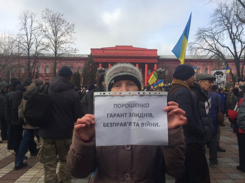 "Большинство людей, которые сюда приехали, это люди пожилого возраста. Они считают, что требуют не закон об импичменте, чтобы он вообще существовал в законодательстве, а именно импичмент Порошенко. Здесь на плакатах - карикатуры президента, различные его обещания, которые он якобы не выполнял" , - сообщила журналистка Громадського Радіо.