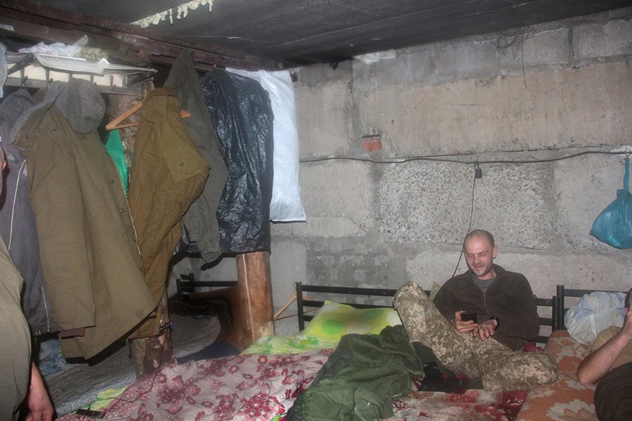 Мы спускаемся в укрытие, оборудованное в одном из подвалов. Внутри хорошо натоплено и тепло, горит свет, пахнет едой и обжитым домом. Под ногами крутится непременная кошка, один из бойцов возится у печки, кто-то играет на планшете, кто-то спит, отвернувшись к стене.