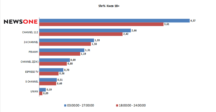 Киевская аудитория старше 18-ти лет традиционно смотрит NEWSONE с большим интересом, про что говорят цифры: rat – 1,2%, shr – 3,61%, твердо фиксируя телеканал на 1-ом месте.