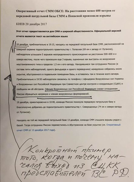 Представитель Украины в рабочей подгруппе по вопросам безопасности Евгений Марчук представил подтверждение того, что российские военные в составе Совместного центра по координации и контролю режима прекращения огня на Донбассе (СЦКК) вышли из СЦКК 18 декабря.