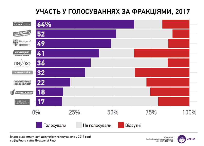 В наибольшем количестве голосований не участвовали народные избранники от групп Воля народа (83,1%) и Возрождение (82,4%), в наименьшей - депутаты от Самопомичи (приняли участие в 64% голосований).