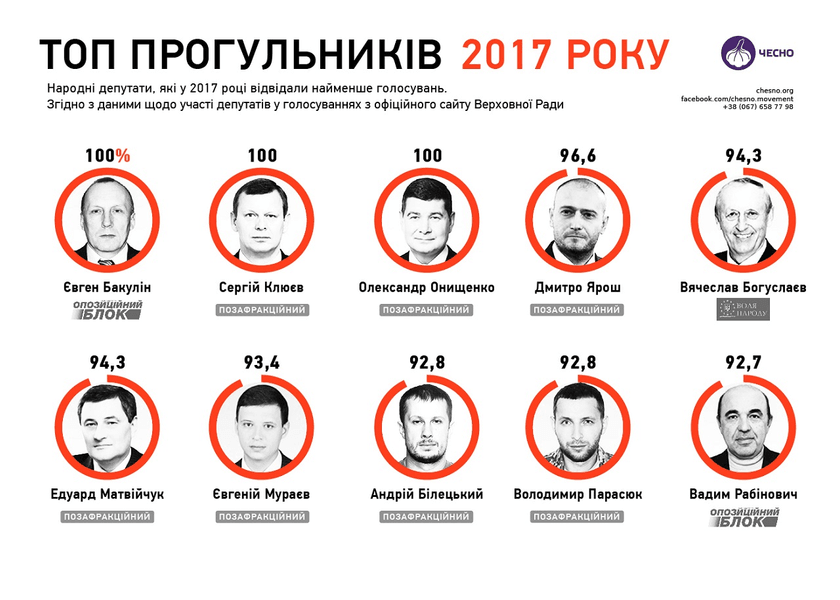 Ни разу не голосовали Сергей Клюев, Александр Онищенко и Евгений Бакулин. Все они умеют проблемы с законом в Украине. Также низкой посещаемостью сессионной залы парламента отметились Дмитрий Ярош, Вячеслав Богуслаев, Эдуард Матвийчук, Эвгений Мураев, Андрей Билецкий, Вадим Рабинович и Владимир Парасюк.
