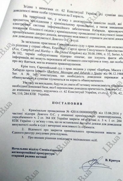 В связи с эти, "беря во внимание объективную невозможность собрания необходимой доказательной базы" начальник третьего отдела САП постановил закрыть уголовное делов отношении Довгого.