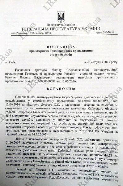 "В связи с десятилетней давностью событий, которые являются предметом исследования в уголовном производстве, а также уничтожением электронной системы информационного обеспечения Киевсовета, учитывая показания большинства свидетелей в уголовном производстве и в виду отсутствия других процессуальных источников доказательств, исчерпаны возможности получить достаточные доказательства для доказывания вины Довгого О.С. в суде", - говорится в постановлении.