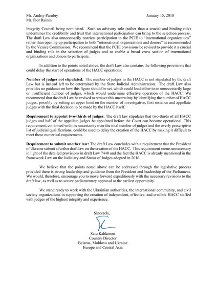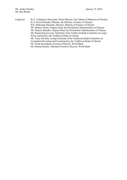 Международный валютный фонд обращался к главе администрации президента Игорю Райнину, рассчитывая, что президент Порошенко подаст в Раду исправленный законопроект. Это вызвало критику Банковой, где заявили, что не намерены подавать новый законопроект. Зато в письме ВБ за подписью регионального директора Сату Кахонен главным адресатом является председатель Верховной Рады Андрей Парубий. При этом в ВБ отметили, что подача нового законопроекта не является обязательной, достаточно изменения ранее поданного законопроекта.