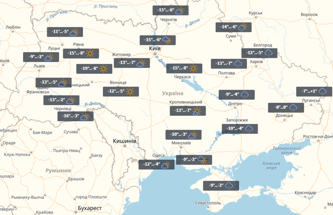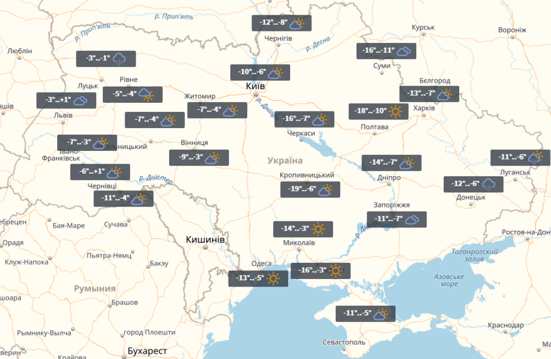 В среду, 24 января, в Украине без осадков. Холоднее всего будет в центральных и восточных областях. На Кировоградщине - до -19°. Теплее всего будет в западных областях. Тут до -11°.