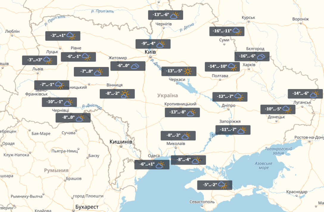 В пятницу без осадков. На востоке до -16°, в остальных регионах -13°...-3°.