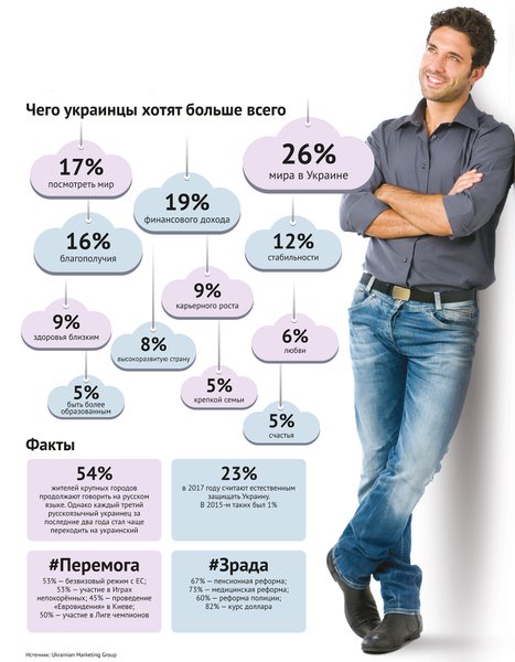 Что у нас на уме, то у социологов на языке. Ukrainian Marketing Group провела репрезентативное исследование, опросив 500 жителей крупных городов старше 16 лет, и выяснила много интересного о мечтах, "зрадах" и "перемогах" украинцев
