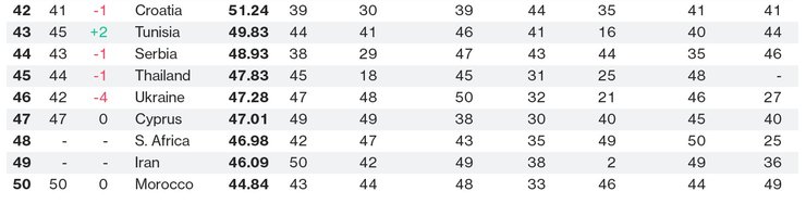 Последние три года Украина стабильно теряет позиции в этом рейтинге. Заняв в 2015 году 33 строчку, в 2016 году Украина опустилась на 41 место, а годом позже – на 42 место. Сейчас в списке Украина опережает лишь Кипр, Южную Африку, Иран и Марокко.