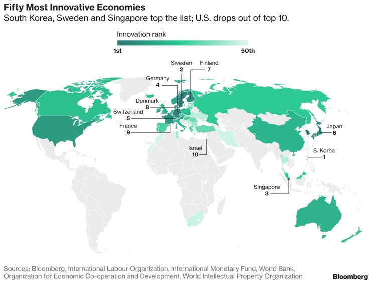Bloomberg составляет рейтинг, основываясь на семи критериях. Среди них — траты на R&D, количество технологичных публичных компаний, научный потенциал и так далее.