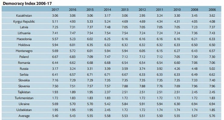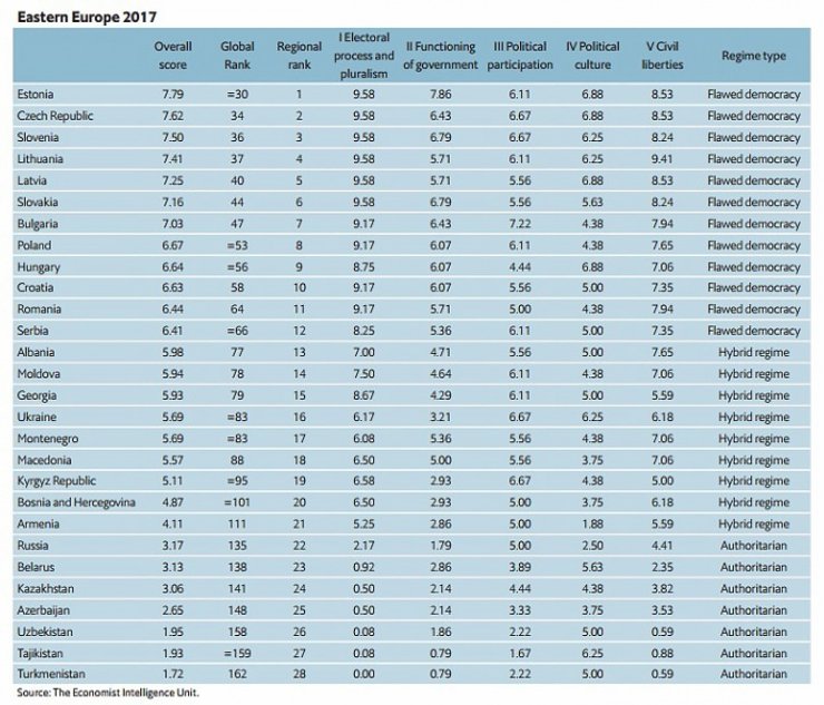 К авторитарным режимам отнесены Россия (135 место), Беларусь (138) и Казахстан (141).