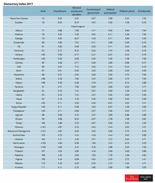 Украина заняла 83 позицию из 167 в рейтинге Democracy Index 2017, подготовленном организацией Economist Intelligence Unit. Об этом сообщает Украинская правда.