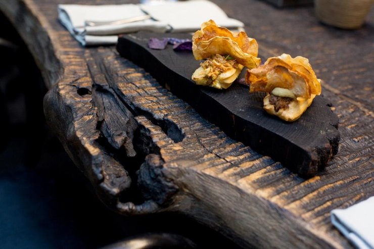 Для нас было важно процитировать модные тенденции и их характер не напрямую. Размышляя о форме и содержании, сфокусировались на актуальных рюшах и воланах, которые удачно передали в закусках, стилизуя эклеры чипсами из сельдерея и фиолетового картофеля, расставляя цветовые акценты, дополненные лавандовой веткой. Основное блюдо вдохновлено трендом "Разные половины" гарнир и стейк приправленные соусами актуального оттенка зеленого, разделяет кость", - рассказал Кирилл Харитонцев.