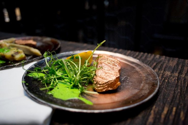 Для основы дизайна меню выбрали 3 активных цвета сезона: глубокий зеленый, фиолетовый и оранжевый, дополнительный - бежевый и золотой. Все они нашли свое отражение в каждом из блюд, а также линии коктейлей. Оформленные в актуальных тенденциях подавали фирменные эклеры Стейкхауса - с лососем собственного копчения и тушеной бараниной с хумусом, стейк с теплым мятым картофелем и азиатским песто. На десерт - яблочно-грушевая тарта.