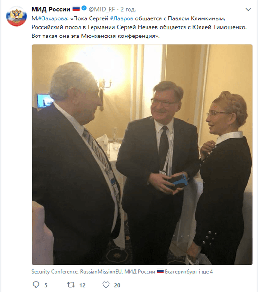 "... российский посол в Германии Сергей Нечаев общается с Юлией Тимошенко. Вот такая она эта Мюнхенская конференция ", - говорится в сообщении внешнеполитического ведомства РФ.