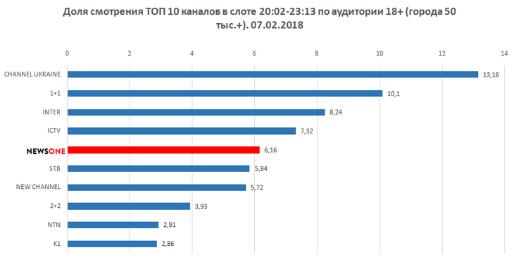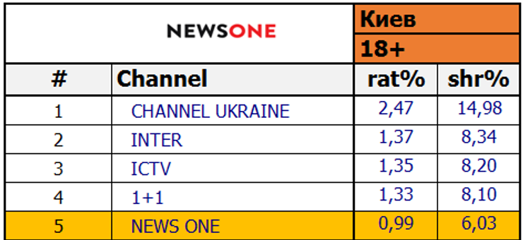 - Показатели мониторинга в Киеве по ЦА 18+ возросли на 40%: rat – 4%, shr – 10,1% (цифры от 14.02.2018: rat – 2,67%, shr – 7,29%). Данные показатели вывели NEWSONE в ТОП-5 телеканалов страны по Киеву.*