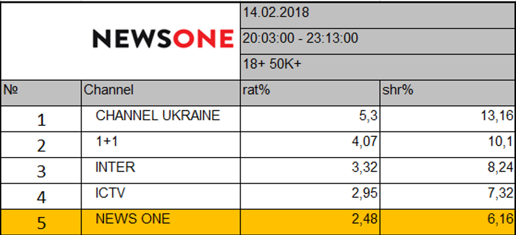- "Украинский формат" - в 1,5 раз увеличил долю смотрения по важной целевой аудитории 18+50К: rat – 2,5%, shr – 6,2%, тем самым закрепив NEWSONE в ТОП-5 общенациональных телеканалов Украины в слоте с 20:06 до 23.13. На "пиках" NEWSONE поднимался на 4-ю позицию (!). Для сравнения:14 февраля показатели той же ЦА были: rat – 1,56%, shr – 4%.