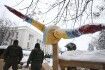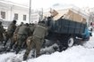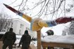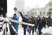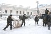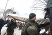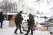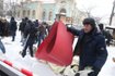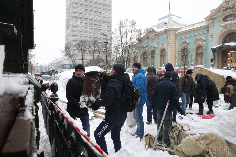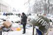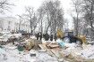 После этого начался снос палаток. Грузовики и трактор вывозили конструкции активно, за 10 минут с территории на проезжей части улицы Грушевского выехали два заполненных досками и другими элементами конструкций грузовика, а также один трактор.