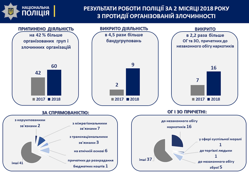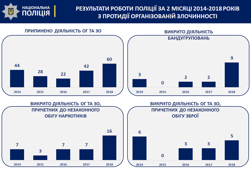 За два месяца 2018 года правоохранители пресекли деятельность 60 организованных преступных группировок. Об этом сообщил замглавы Нацполиции Вячеслав Аброськин, передает пресс-служба ведомства.