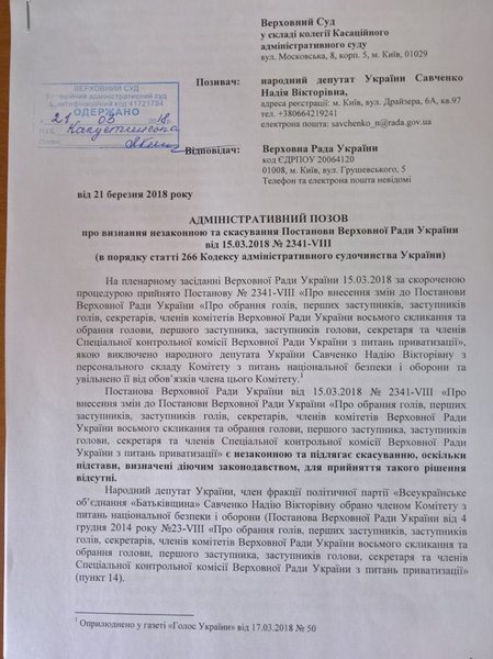 "Невозможно исключить члена комитета из комитета. В законодательстве Украины есть только механизмы отзыва председателя комитета, заместителя председателя и секретаря комитета", - объяснила Савченко свою мотивацию для подачи иска.