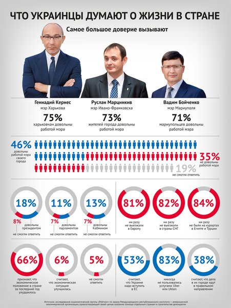 Еще один заметный тренд: уровень удовлетворенности граждан действиями центральной власти снижается, местной — растет. Лишь 18% горожан одобряют работу президента. При этом примерно половина поддерживает деятельность мэра (в данном случае абстрактного). Максимальный рейтинг у мэра Харькова Геннадия Кернеса — он набрал 75% голосов. На втором месте городской голова Ивано-Франковска Руслан Марцинкив (73%). Третья позиция у главы местной власти Мариуполя Вадима Бойченко (71%).