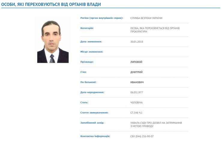 Информация о розыске Липового появилась на сайте МВД в разделе "Лица, которые скрываются от органов власти".
