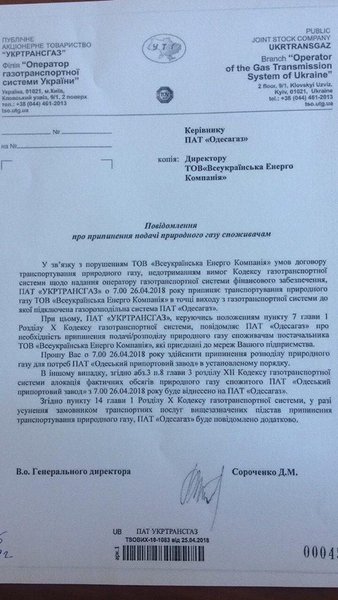 "Сегодня принято решение о полной остановке ОПЗ. Причина - получение уведомления от "Укртрансгаза" о нарушении "Всеукраинской энерго компанией" условий договора транспортировки газа на ОПЗ и приостановке подачи газа на завод", - написал он на странице в Facebook.