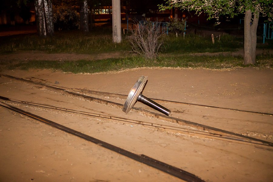 Трамвай № 12 направлялся из тупика в сторону проспекта Богдана Хмельницкого. На самом выезде во втором вагоне отпала левая ось колесной пары. Водитель сразу ничего не почувствовал и продолжил движение, однако через несколько метров вагон сошел с рельсов.