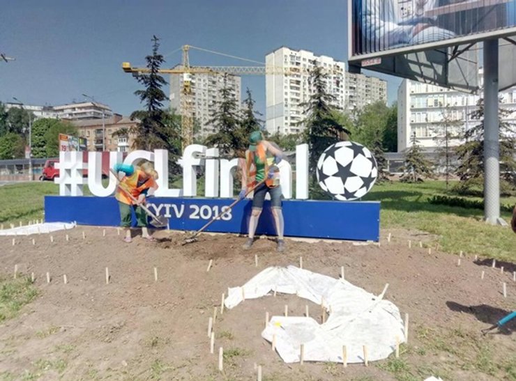 Сотрудники Киевзеленстроя вдоль трасс устанавливают тематические цветочные панно и конструкции объемных надписей с использованием официального хэштега #UCLfinal.