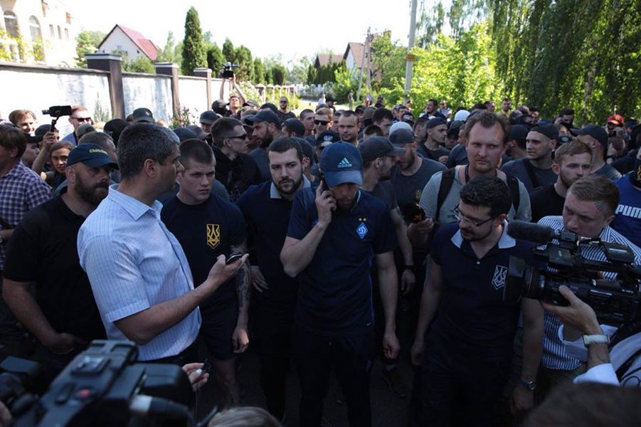 Как сообщает "ТСН", позже члены "Национального корпуса" прорвали оцепление правоохранителей возле дома Левочкина и подожгли файеры. Проникнув на территорию помещения, активисты ходили по недостроенной части двора, обрисовывали здание граффити и клеили на стены постеры с надписью "Интер будет наш".