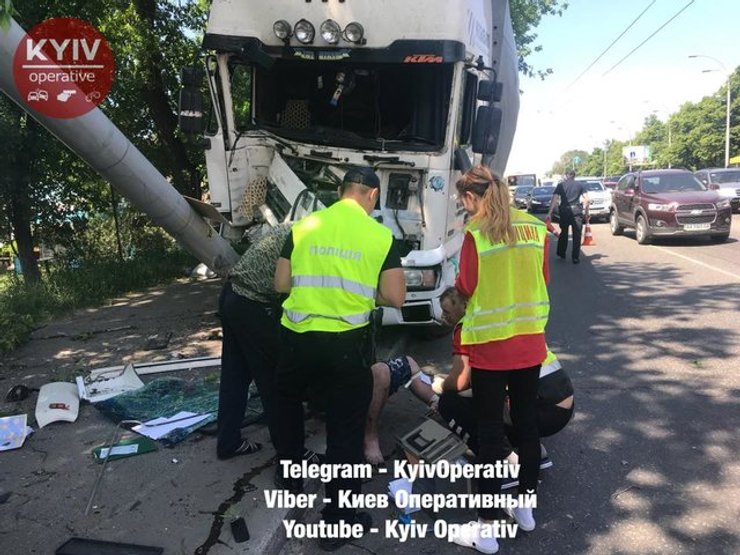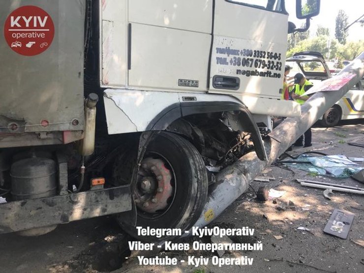В Киеве на проспекте Лобановского водитель грузовика DAF на огромной скорости снес столб, после чего машина вылетела на тротуар.