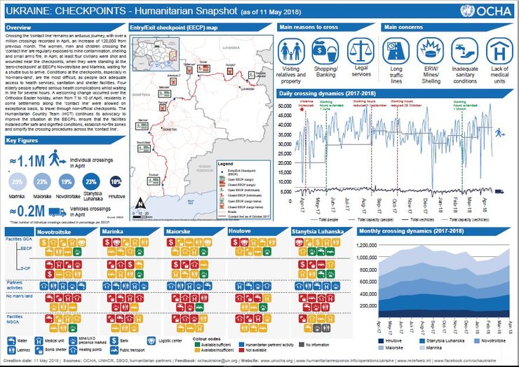 "Женщины, мужчины и дети, которые пересекают линию разграничения, регулярно подвергаются опасности от мин и обстрелов. В апреле по меньшей мере четверо гражданских лиц были подстрелены и ранены около точек перехода, когда они стояли на "нулевых блокпостах" на КПВВ Новотроицкое и Марьинка, ожидая прибытия автобуса", - говорится в сообщении.