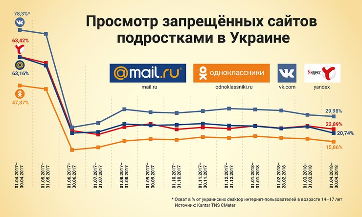 Однако запрет все же сказался на российских сайтах. По данным Интернет Ассоциации Украины, вскоре после введения санкций аудитория "Одноклассников" и "ВКонтакте" просела примерно на 40%. Исследователи считают, что 20% людей ушли в Facebook, 5% — в Instagram, еще 15% спустя некоторое время вернулись к привычным ресурсам, почитав в интернете, как обойти блокировки. Отток аудитории подтверждает и исследовательская компания Kantar TNS: если в апреле 2017 года на страничку "Яндекса" заходило 12,5 млн украинцев, то год спустя количество заходов сократилось до 4,5 млн в месяц. Изучив динамику посещения украинцами наиболее популярных запрещенных сайтов, легко заметить, что интерес наших людей к этим интернет-ресурсам снизился, однако на нет не сошел.