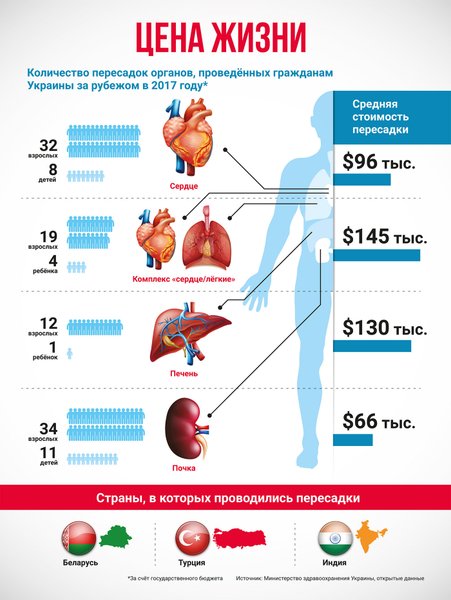 На средства, которые были перечислены из госбюджета Украины в иностранные клиники для лечения наших граждан в 2013–2015 годах ($2,4 млн и 612 тыс. евро), сделано шесть трансплантаций костного мозга, восемь трансплантаций сердца, пять — печени и 18 пересадок почки. Имея налаженную систему трансплантации в Украине, подсчитали в парламентском Комитете по здравоохранению, на эти средства можно было бы сделать 1,1 тыс. пересадок сердца, 116 —печени и 5,6 тыс. трансплантаций почки.