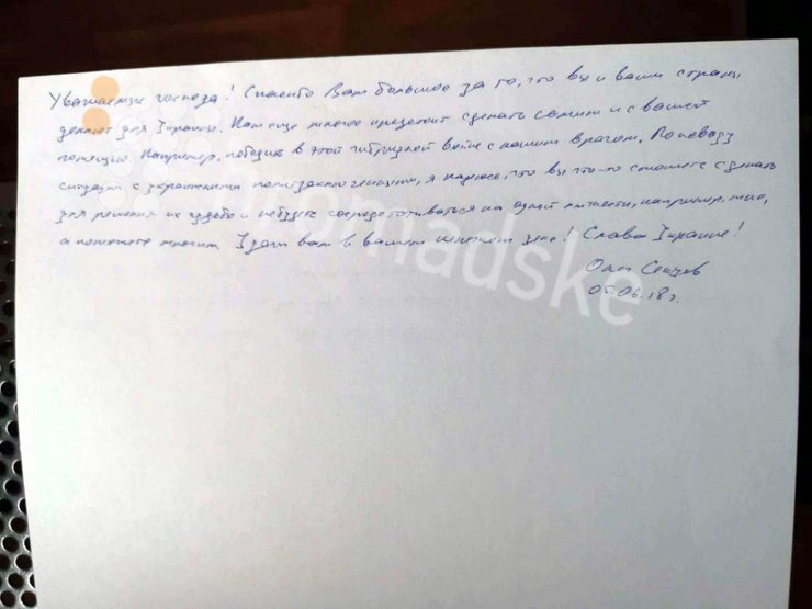 "Уважаемые господа! Спасибо Вам большое за то, что вы и ваши страны делаете для Украины. Нам еще многое предстоит сделать самим и с вашей помощью. Например, победить в этой гибридной войне с нашим врагом. По поводу ситуации с украинскими политзаключенными, я надеюсь, что вы что-то сможете сделать для решения их судеб и не будете сосредотачиваться на одной личности, например, мне. А поможете многим. Удачи вам в вашем нелегком деле! Слава Украине!".