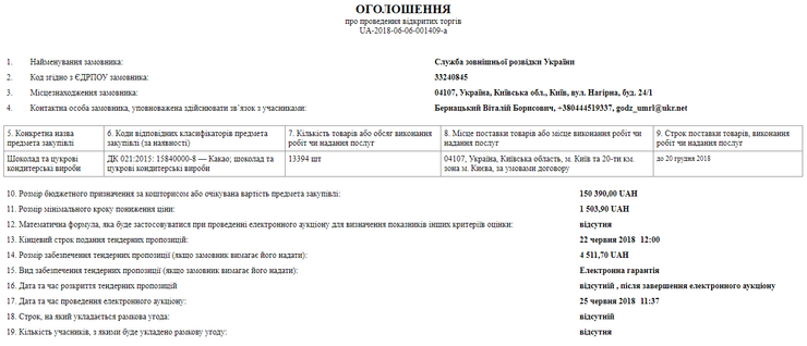 Служба внешней разведки объявила тендер на закупку кондитерских изделий на 150 тысяч гривен.