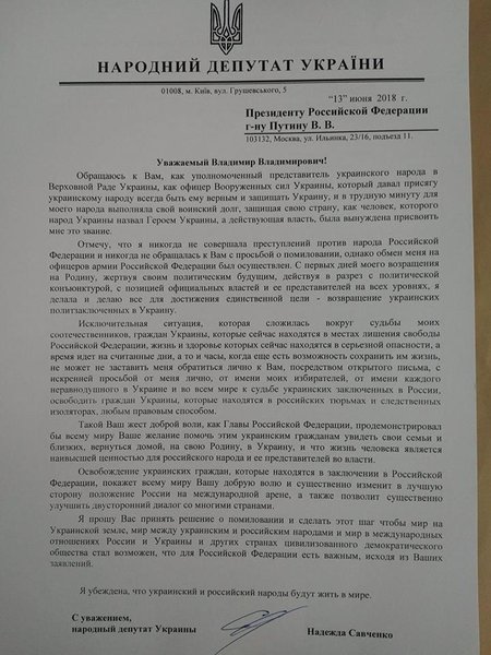 "Исключительная ситуация, которая сложилась вокруг судьбы моих соотечественников, граждан Украины, которые сейчас находятся в местах лишения свободы Российской Федерации, жизнь и здоровье которых сейчас находятся в серьезной опасности, а время идет на считанные дни, а то и часы, когда еще есть возможность сохранить им жизнь, не может не заставить меня обратиться лично к Вам, посредством открытого письма, с искренней просьбой от меня лично, от имени моих избирателей, от имени каждого неравнодушного в Украине и во всем мире к судьбе украинских заключенных в России, освободить граждан Украины, которые находятся в российских тюрьмах и следственных изоляторах, любым правовым способом", - говорится в письме Савченко.