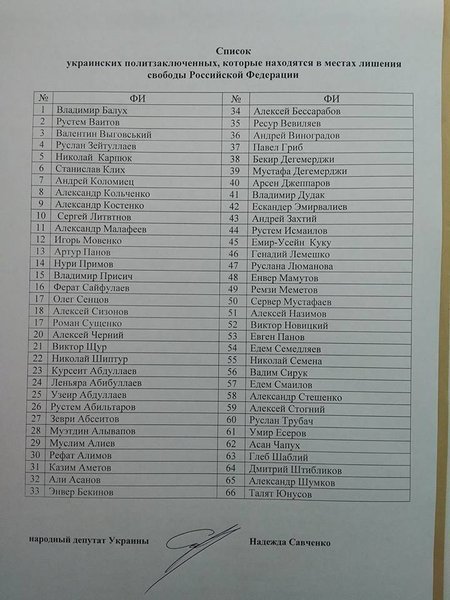 К обращению прилагается список фамилий украинских политзаключенных, находящихся на территории России (всего 66 человек).