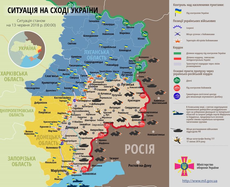 Пресс-служба Минобороны предоставила карту ситуации на востоке Украины по состоянию на 00:00 четверга, 14 июня