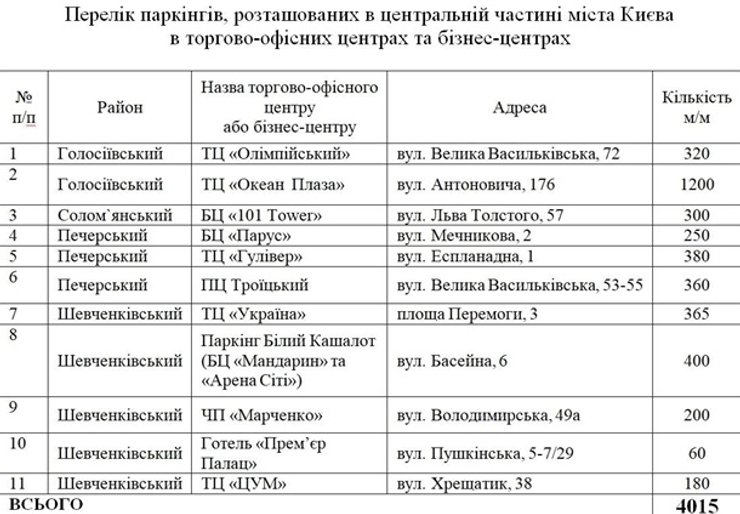 Киевские власти опубликовали список паркингов в торгово-офисных центрах в столице.