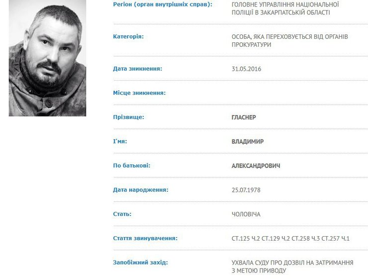 С 31 мая 2016 года Владимир Гласнер находился в розыске по ст.125 (умышленное легкое телесное повреждение), ст.129 (угроза убийством), ст.258 (теракт), ст.257 (бандитизм) Уголовного кодекса.