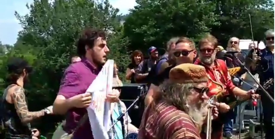 Импровизированный концерт попытался сорвать молодой парень с плакатом "Геть рашистів з України". Однако его быстро увели в сторону и выступление продолжилось.