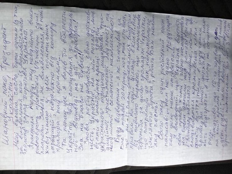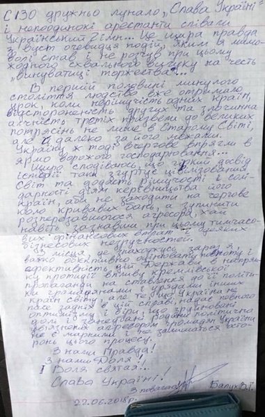 Об этом сказал президент Украины Петр Порошенко на своей странице в Facebook. К своему посту он приложил фото письма удерживаемого в Крыму украинца Владимира Балуха.